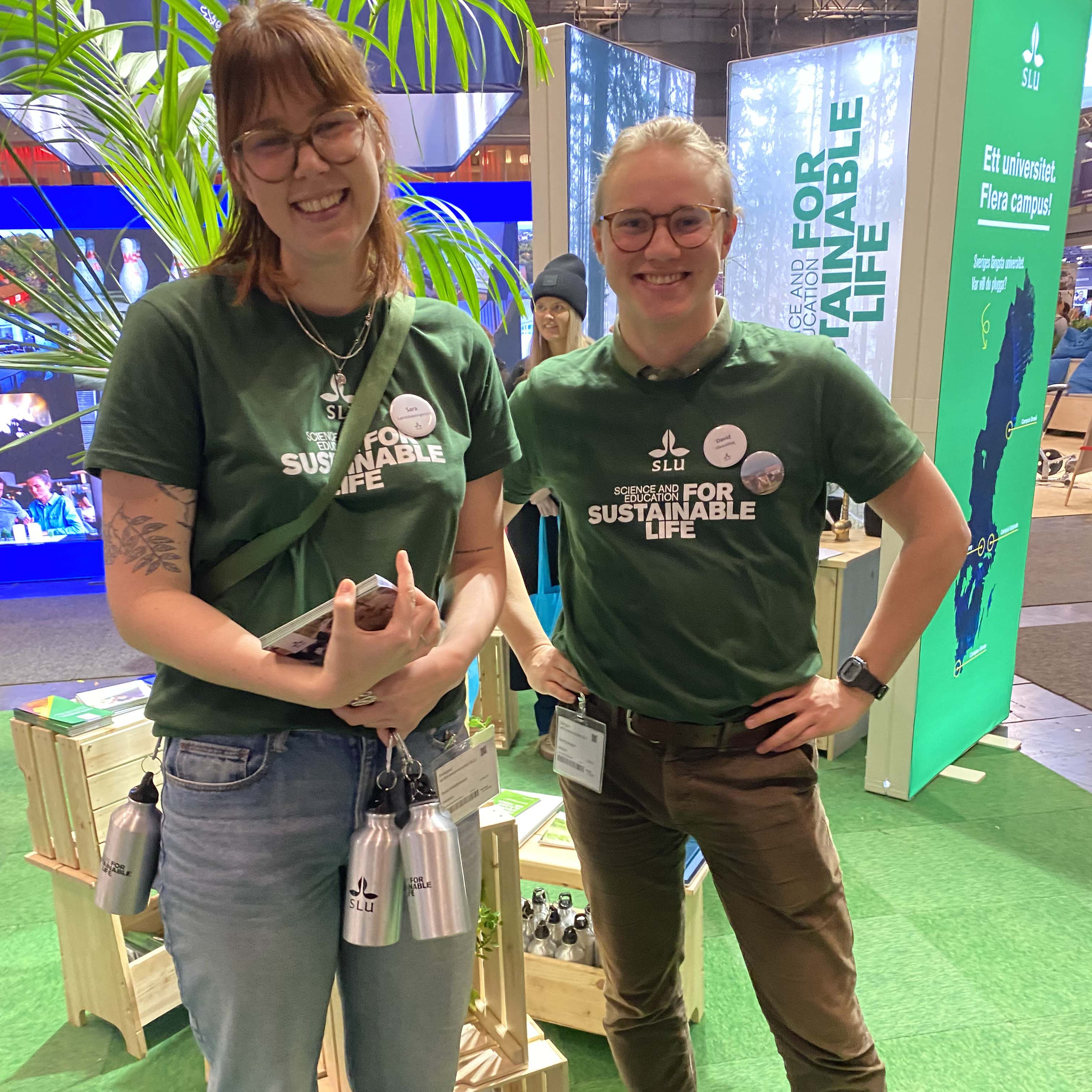 Mässan lockade både gymnasister och unga vuxna som funderar på karriärbyte. Och mitt i sorlet på mässgolvet, i en grön monter med möjlighet att fylla på vatten i de utdelade vattenflaskorna berättade våra studentambassadörer om sina yrkesval och om utbildningsutbudet som finns på SLU.