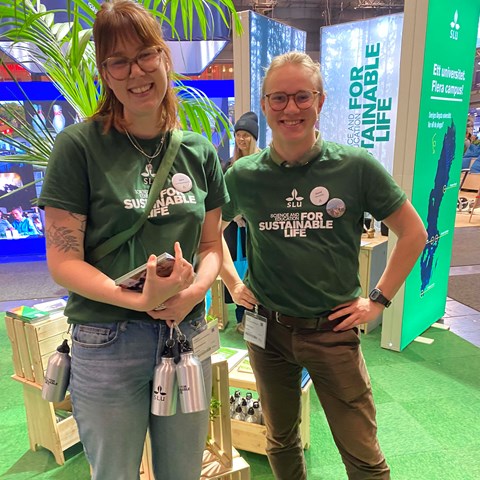 Båda uttrycker en känsla av att montern speglar SLU väl i sin utformning med färger, inredning av trä, pilar som pekar på olika utbildningar, grönskande växter och framför allt vattenkranen, placerad mitt i montern i ett ställ av sten.