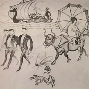 – Teckningen, som är ritad på enkelt brunt papper, är full av karikatyrer. Man kan se hur en lärare vattnar sina käpphästar, en annan lärare, oerhört blyg för flickor, befinner sig sittande med en kvinna i knäet, berättar Göran Jönsson (Jins), intendent vid Veterinärmuseet i Skara.