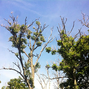 Two tree crowns in Sweden are compared, both infected with the fungus that is the cause of the mass death of ashes. On the left is Fraxineus mandshurica where the fungus does not cause disease symptoms and to the right Fraxineus excelsior that is seriously affected. Photo: Michelle Cleary.