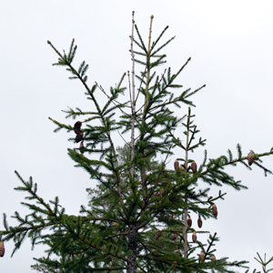 Gremmeniella abietina is a fungus attacking pine and spruce trees in Sweden, causing lesions in buds and discolored needles that are later shed. During particularly beneficial circumstances, the infection may spread from needles to the branches, leading to tree mortality. This only occurs when the amount of spores is high after rare 3-year-cycles of recurring rainy summers and mild winters. This means that the disease is usually not very prevalent, but may sometimes cause violent epidemics.