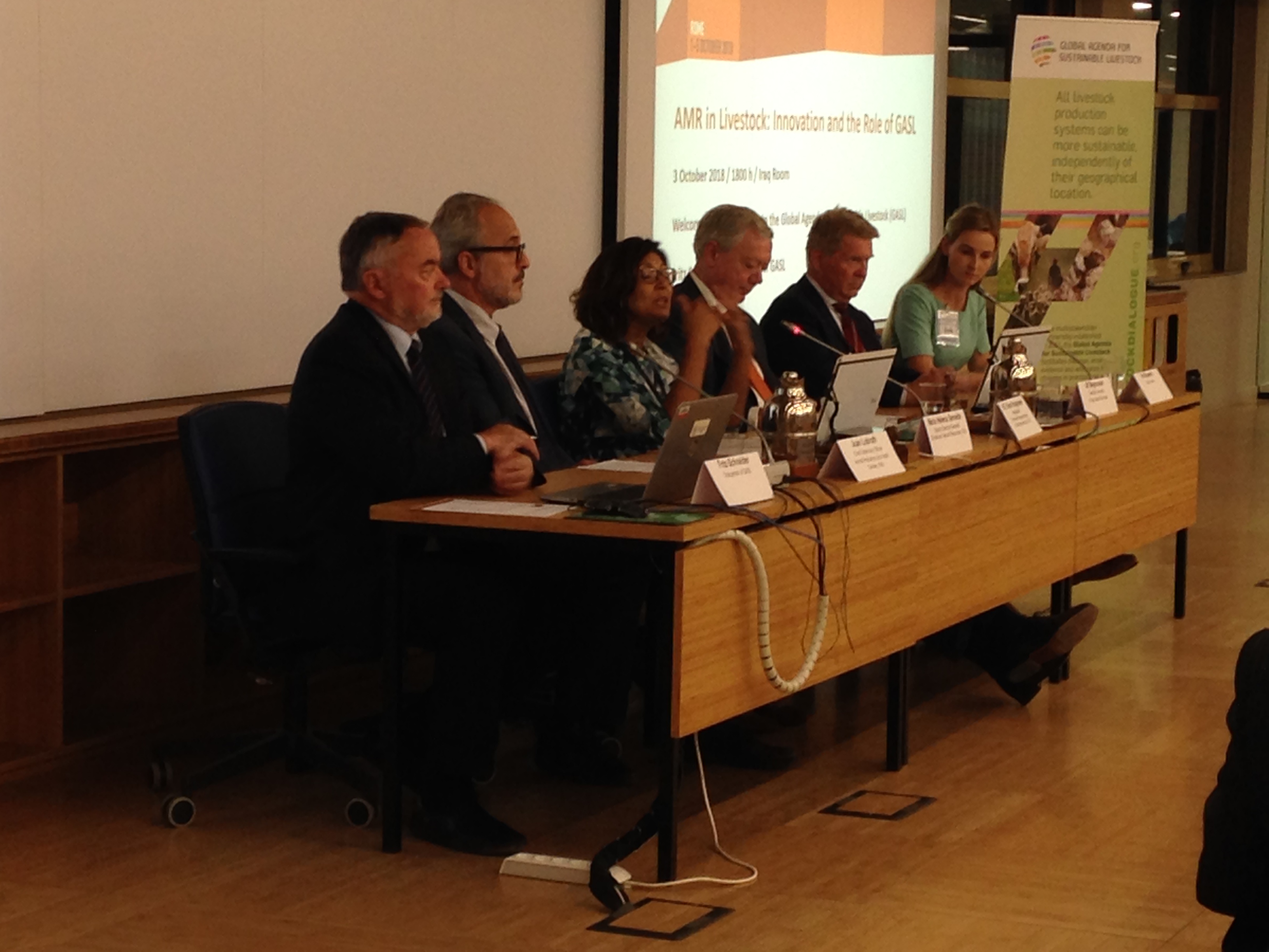The title of the side event was AMR in Livestock: Innovation and the role of the GASL . The event was opened by the Dutch ambassador Hans Hoogeveen followed by an overview of the FAO’s work on AMR by FAO’s Deputy Director General Maria Helena Semedo. Ulf Magnusson then gave a presentation of the work within the Livestock Antimicrobial Partnership, LAMP, which is an action network within the GASL and hosted by SLU Global which was followed by a presentation of FAO’s Chief Veterinary officer Juan Lubroth and the Dutch pig-farmer Iris Bouwers.