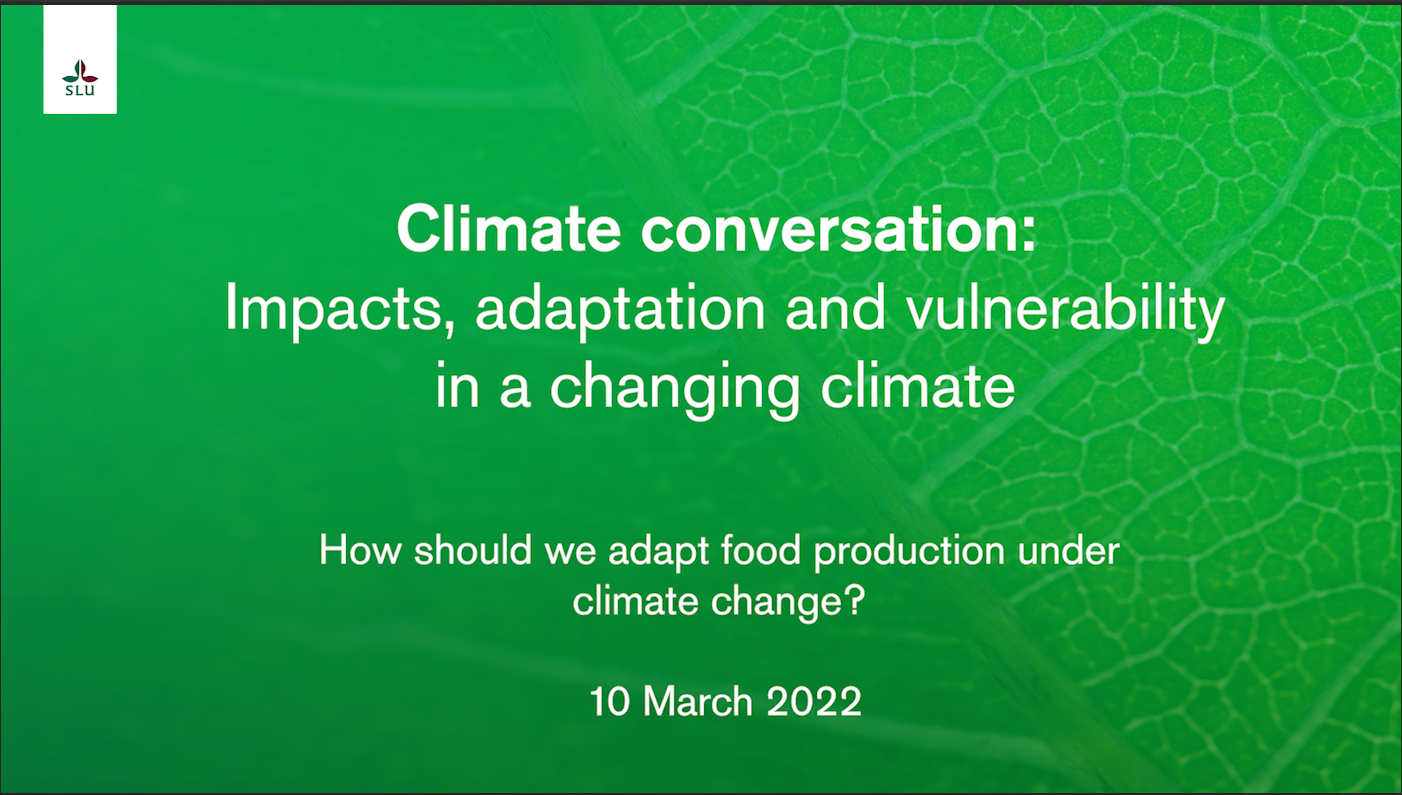 SLU Global and the four future platforms are continuing the climate conversations based on the IPCC Sixth Assessment Report. The webinar 10 March was paying attention to the latest report focusing on impacts, adaptation and vulnerability and gathered almost one hundred partcipants.