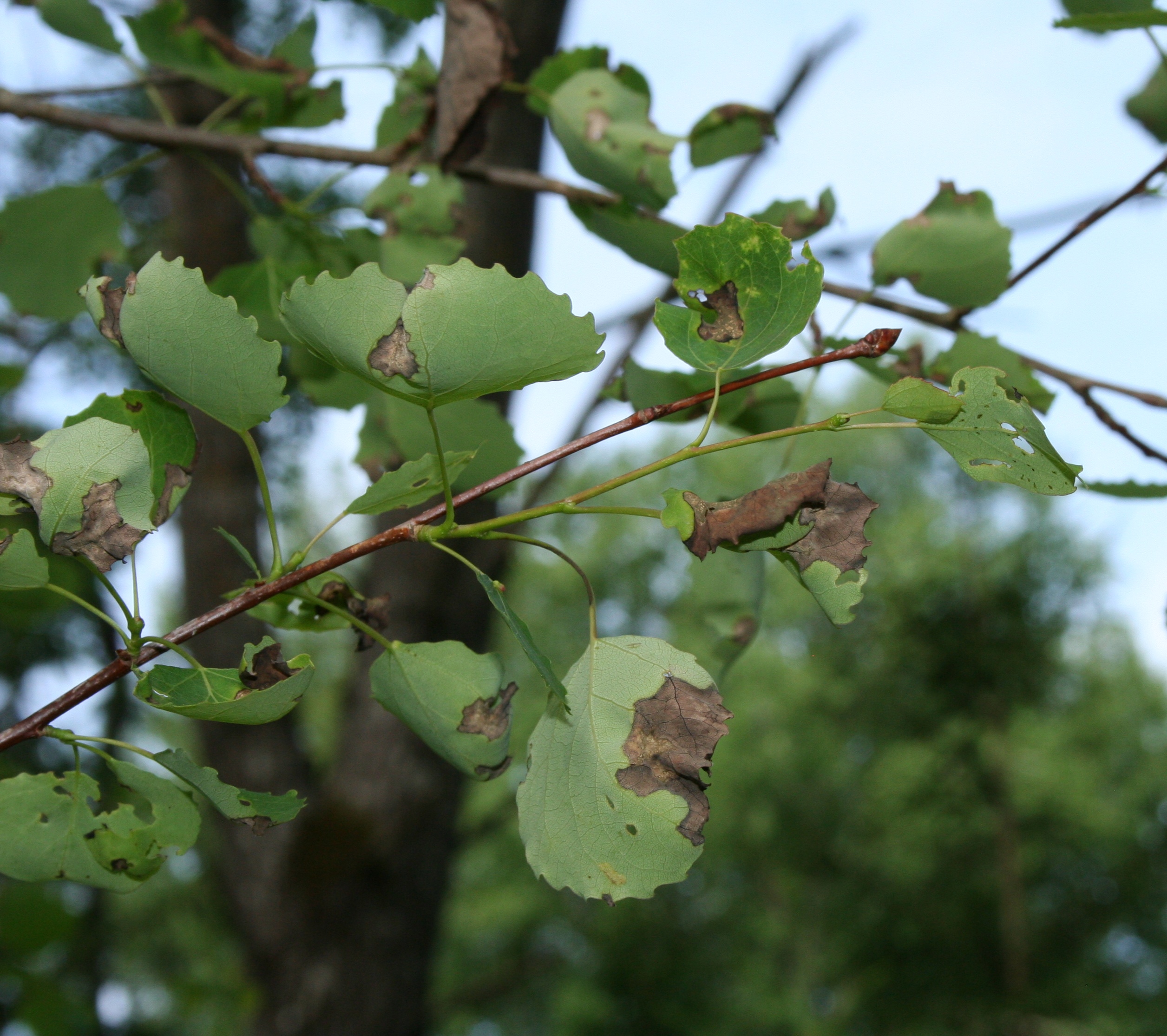 Aspskorv är en svampsjukdom som drabbar aspblad och unga skott framför allt på aspsly. Redan förra året (2015) uppmärksammades att stora aspar hade likadana angrepp och i år har vi flera belägg för att stora aspar angrips. Symptombilden är ny för oss, men tills vidare räknar vi med att det rör sig om samma svamp som vi ser på aspsly. Svampen orsakar svartfläckiga och buckliga blad och unga skottspetsar svartnar. Skadorna ser fula ut, men träden klarar dessa angrepp.