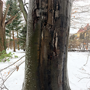 En bok i Kunskapsparken på Ultuna har en mörk blödning på stammen, något som undersöktes vidare av trädgårdsmästaren, en student och två forskare. Undersökningar visade att sjukdomen orsakas av aggressiva patogenen Phytophthora cactorum, och fler träd i trädgården kan vara smittade.