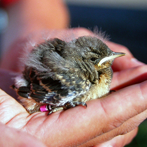 SLU-forskarna har följt stenskvättorna i 25 år. Tack vare den långa tidsserien vet vi till exempel att ungarna väger mindre i dag. Det signalerar att stenskvättan har problem. Foto: Debora Arlt