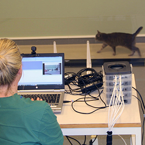 Huskatten Lilla grå går på tryckmätningsmattan. Foto: Henrik Stadig
