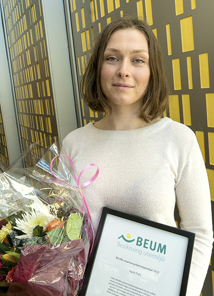 Föreningen Besiktningsmän för utemiljö (BEUM) arbetar för god kvalitet vid byggande av utemiljöer i Sveriges städer. För att stimulera studenter att intressera sig för besiktningsfrågor har BEUM inrättat ett examensarbetesstipendium. Stipendiet delades nyligen ut för första gången och stipendiat blev Karin Pohl som läser tredje året på landskapsarkitektutbildning vid SLU i Alnarp.