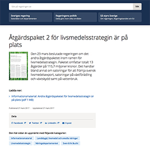 Den 23 mars beslutade regeringen om det andra åtgärdspaketet inom ramen för livsmedelsstrategin. Paketet omfattar totalt 13 åtgärder på 115,7 miljoner kronor. Det handlar bland annat om satsningar för att främja svensk livsmedelsexport, satsningar på växtförädling och växtskydd samt på vattenbruk.
