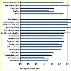 - Bildtext till diagrammet högst upp på sidan (Ur: Forskningsbarometern 2017): Utvecklingen av citeringsgenomslag (andel högciterade publikationer) för olika grupper av lärosäten och ett antal enskilda lärosäten i Sverige. Artiklar publicerade 2008–2010 respektive 2013–2015. I kategorin Övriga ingår huvudsakligen företag, sjukhus (inte universitetssjukhus) och myndigheter utanför högskolesektorn. Konstnärligt inriktade högskolor och enskilda utbildningsanordnare redovisas inte på grund av ett för litet antal publikationer. Källa: Clarivate Analytics.