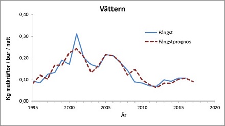 I Vättern beräknas att den relativa fångsten 2017 landar på 90 gram matkräftor per bur och natt, en nedgång med 15 procent jämfört med förra året. Totalfångsten i yrkesfisket beräknas till 97 ton om fisketrycket blir normalt.