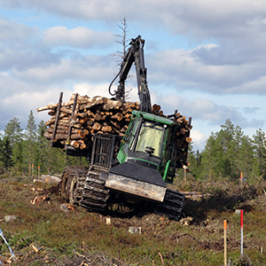 Körning på en av försöksytorna i Rotflakamyran år 2012 med en fullastad skotare som väger 35 ton. Foto: Linnea Hansson
