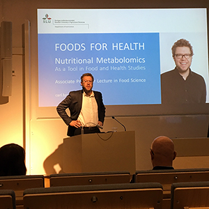– Ur fakultetens perspektiv är docentantagningen en viktig kvalitetsstämpel på våra nya huvudhandledare - de utbildar ju nästa generation forskare! Årets docentförläsare Carl Brunius höll en mycket entusiastisk föreläsning där han berättade om svårigheter och lösningar när det gäller datakvalitet och statistiks analys av data inom området metabolomik, allt med relevans för nutrition och hälsa. Metabolomik innebär att i en enda kemisk analys studera metaboliter (små molekyler) i ett prov, vilket genererar stora datamängder av högdimensionell struktur.