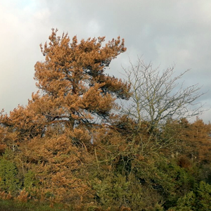 Svampen Diplodia pinea infekterar friska tallbarr under deras första växtsäsong. Träden som påverkas mest av sjukdomen är yngre planterade tallar, och sjukdomen förekommer sällan i äldre träd om de inte är stressade.