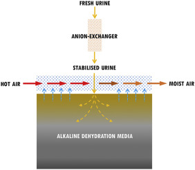 Briefly, fresh human urine was stabilised by passage through an anion–exchanger, added to an alkaline media (wood ash or alkalised biochar), and dehydrated. Urine dehydration was investigated at three temperatures: 40, 45 and 50 °C. The influence of various factors affecting the dehydration process was modelled and the rate of urine dehydration was optimised. Results indicated that 75% (v/v) of the urine has to pass through the ion–exchanger for alkaline stabilisation of urine to occur. At all investigated temperatures, the dehydrator accomplished >90% volume reduction of ion–exchanged urine, > 70% N retention and 100% recovery of P and K. To realise high degree of nutrient valorisation, this study proposes combining source–separation of human urine with alkaline dehydration.