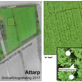I Vinnovaprojekt undersöker vi hur tidigt bladmögelangrepp kan upptäckas med fjärranalys i potatisfält och om detta kan integreras i väderbaserade prognosmodeller och vara en del i ett beslutsstödsystem. För att det skall vara av värde i konventionell odling av mottagliga sorter behöver man kunna upptäcka infektionen mycket tidigt, då det endast finns enstaka fläckar i ett fält. Detta är idag för svårt med nuvarande bildanalysteknik och att utveckla dessa tekniker vidare är målet i Vinnova-projektet. Detta projekt är ett sidoprojekt till EnBlightMe! där vi vill utveckla tekniken med drönarfotografering för att upptäcka infektionshärdar av bladmögel i ekologisk odling. Tekniken kan fungera även för andra avvikande plantor, t.ex. med virusinfektion som odlaren snabbt skulle vilja kunna hitta och avlägsna. Tekniken skulle också kunna vara till hjälp för att hitta fläckar med misstänkta nematodangrepp.