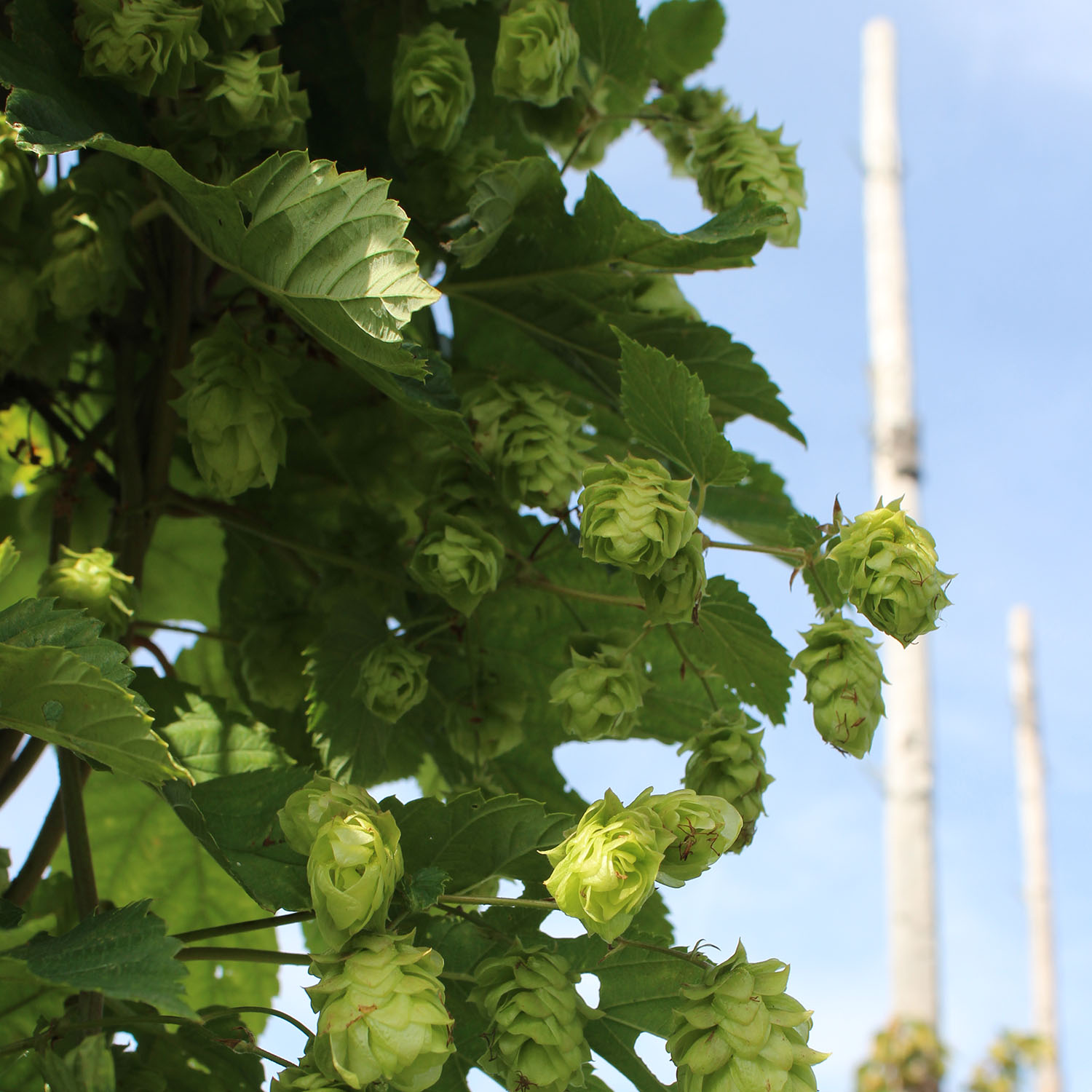 'Svalöf E' Mognar i andra hälften av augusti med medelstora, runda kottar. Gav i provbryggning ett öl med arom av tall/kåda/ceder.