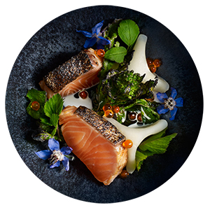 Maträtt med odlad regnbåge producerad av företaget Älvdalslax, som är partner inom projektet "5 ton grön fisk i disk". Foto: Salt Food & Communication/Sara Danielsson