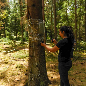 Granbarkborren, Ips typographus, är en allvarlig skadegörare på gran och minskar timmerkvaliteten. Att skörda smittat virke är en metod som används för att bli av med skadedjuret, men den här metoden har problem eftersom insekterna redan kan ha flyttat till nya träd eller ner på marken där de övervintrar. Därför undersöker Maria Sousa om naturliga fiender kan användas som biologiskt bekämpningsmedel mot granbarkborren i sitt doktorandprojekt.