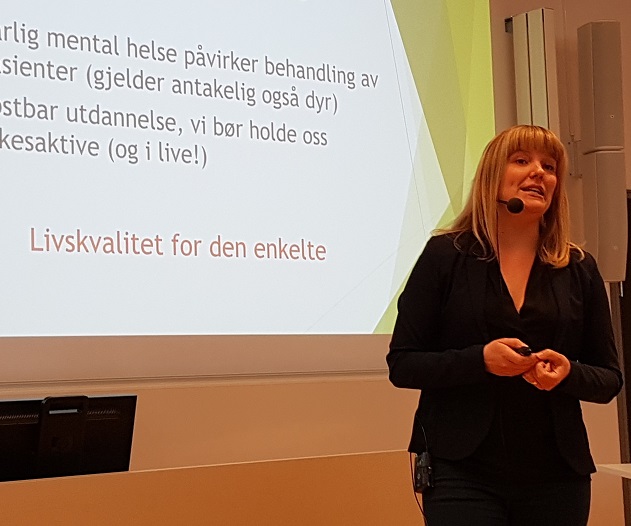 Detta följdes av ett intressant föredrag av Helene Seljenes Dalum, veterinär och forskare vid norska läkemedelsverket. Helene redogjorde för den vetenskapliga kunskap som finns inom området. Det finns bland annat studier som har visar att självmord är särskilt vanligt bland veterinärer, särskilt hos de som jobbar på klinik. Anledningar till detta är oklart och Helene vill nu satsa på ett nytt forskningsprojekt med fokus på just detta. Hon delade även med sig av sina egna erfarenheter av psykisk ohälsa i form av allvarlig ångest, vilket började redan under studietiden.