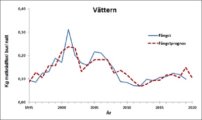 I Vättern beräknas den relativa fångsten 2020 landa på 105 gram matkräftor per bur och natt, en liten uppgång med drygt fem procent jämfört med förra året, då fångsterna hade gått ner något sedan 2017. Totalfångsten i yrkesfisket beräknas till 115 ton om fisketrycket blir normalt och fisket pågår säsongen ut.