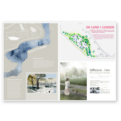 Ett funktionellt och vacker design som väl reflekterar både krematoriet och krematorielunden med sin strama och harmoniska karaktär, en tydlig koppling till kapellets modernistiska uttryck och omkringliggande gravkvarter, samt en stilren och vacker lösning som följer bergets egna former. Platsen kommer till liv med ambitiösa växtval och perennplanteringar, och tar hänsyn till de naturliga höjdskillnaderna, samt bassängen som återanvänds till fontän.