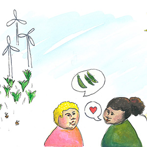 – Går omställningen egentligen så långsamt? Tänk dig hundra år tillbaka och fundera på hur världen då såg ut... Världen förändras extremt snabbt nu, nästan för fort. Vi skulle behöva dra ner på takten, säger Kes och Lina flikar in att människan hela tiden har fått anpassa sig till de teknikframsteg som har gjorts. Vi behöver se på städerna och hur vi lever på ett annat sätt.