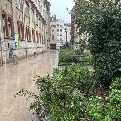 Hur som helst så har skolgatornas planteringar ersatt asfalt och kan nu ta emot regnvatten. Som om det var planerat så regnar det enligt prognoserna upp emot 40 mm dagen då vi besöker skolgatan på rue de la Cour des Noues med tre representanter från Paris stad. Sommaren i Paris var regnig fram till OS startade, sen blev det bättre väder till alla idrottsintresserades glädje. Det är mycket som går Paris väg nu.