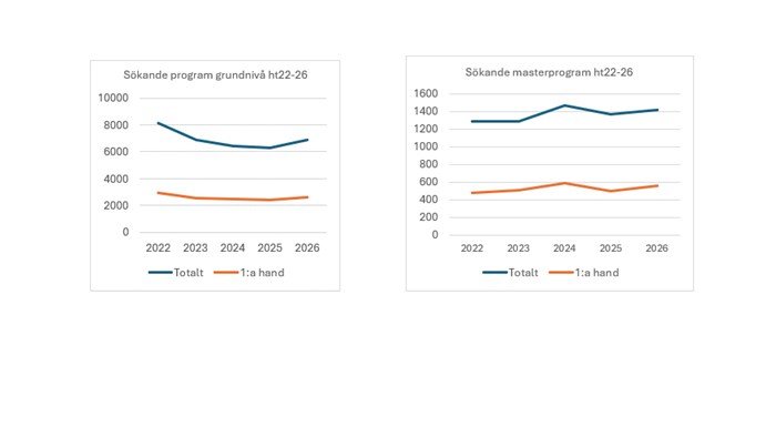 Totalt har antalet förstahandssökande till program på grundnivå ökat med 192 personer, medan program på avancerad nivå har 66 fler förstahandssökande än förra året. Sett över en femårsperiod syns en varierande men överlag stabil utveckling, vilket illustreras i diagrammen nedan.