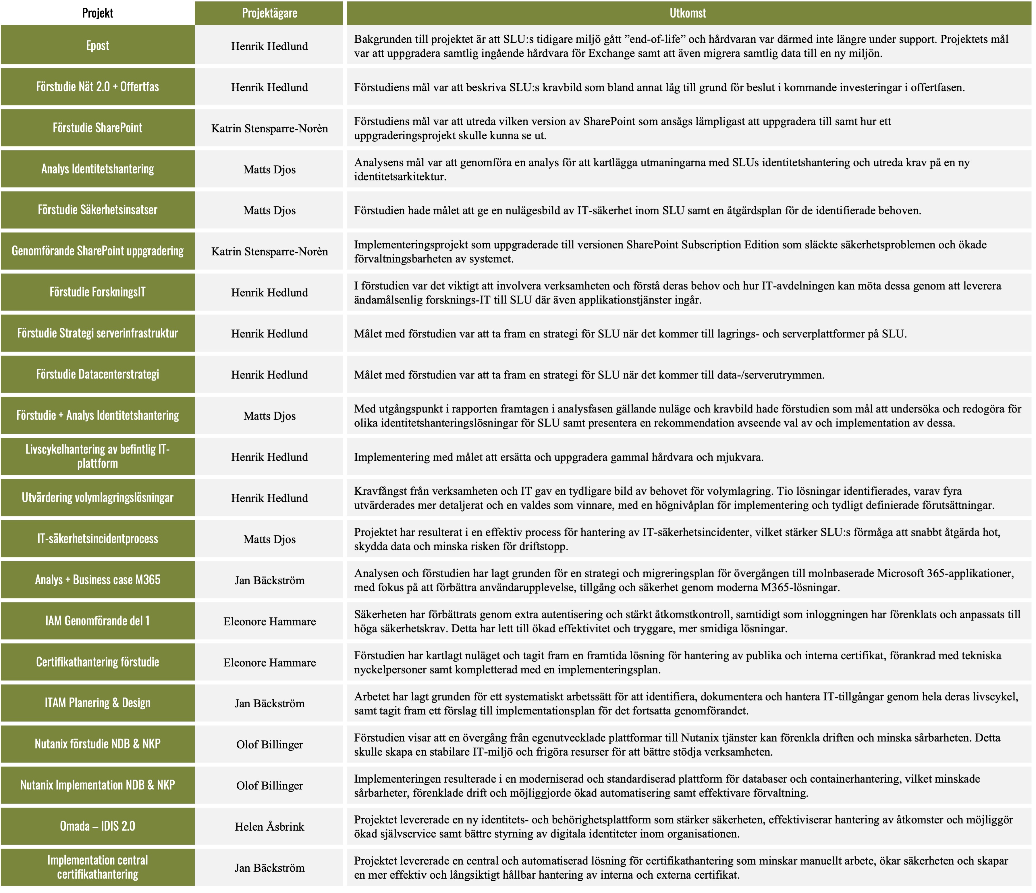 Projektledare: Flertalet, kontakta projektägare vid frågor